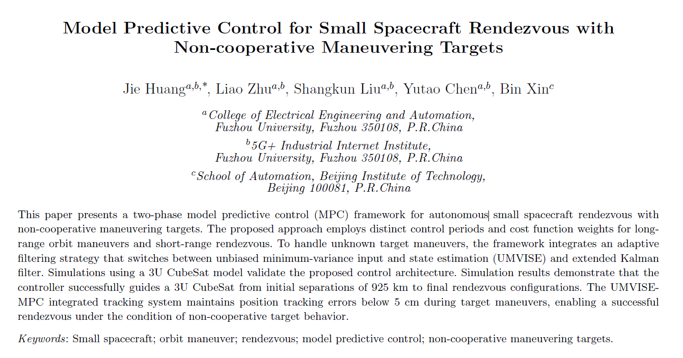 近日,我院黄捷教授指导硕士研究生朱辽在航天器控制领域取得重要研究成果,在国际知名期刊《Unmanned Systems》发表学术论文《Model Predictive Control for Small Spacecraft Rendezvous with Non-cooperative Maneuvering Targets》。黄捷教授作为第一作者及通讯作者,朱辽同学作为第二作者,刘尚坤、陈宇韬老师共同指导,联合北京理工大学辛斌教授共同完成学术论文。